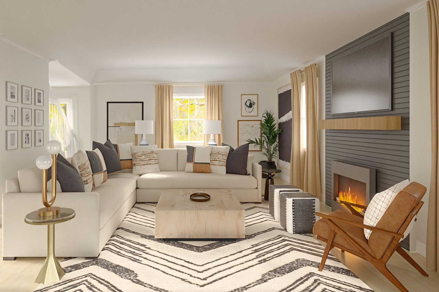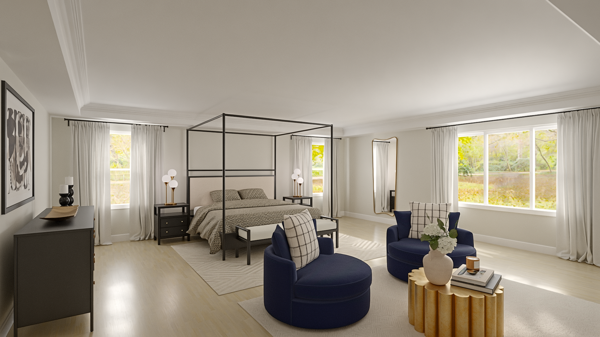 An ultra-modern retreat spanning living, dining, and bedroom spaces. Sleek finishes, strong lines, and a restrained palette create a cohesive, graphic environment designed for both rest and impact.